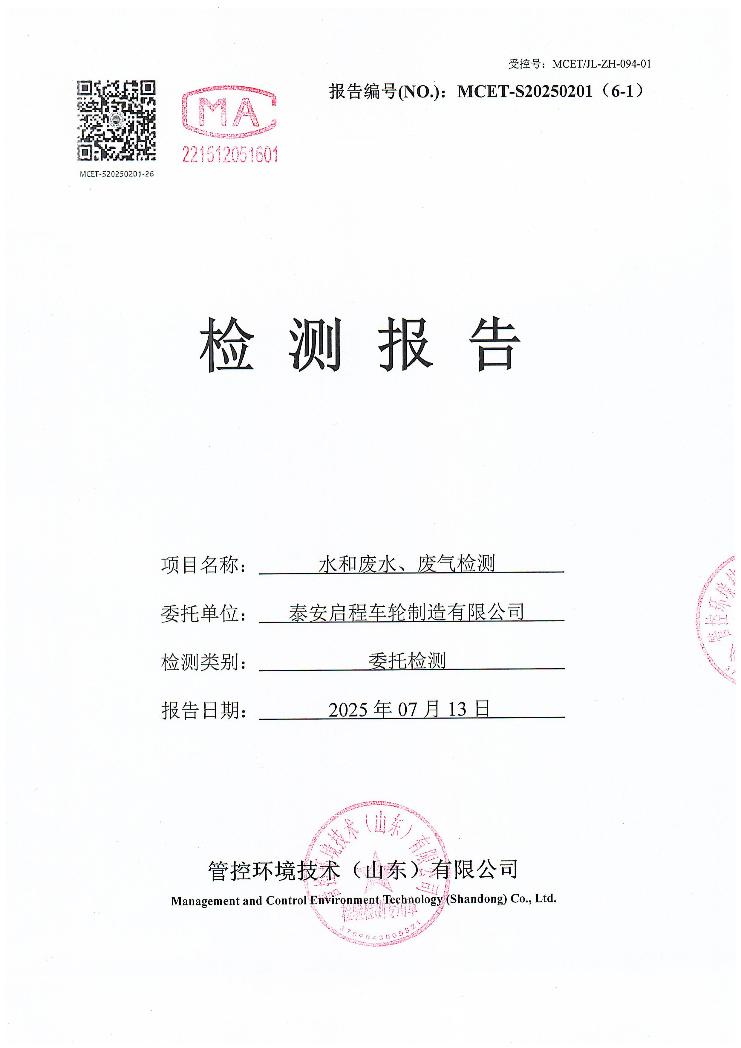 泰安啟程車輪制造有限公司2025年7月份環(huán)境污染物排放檢測報告