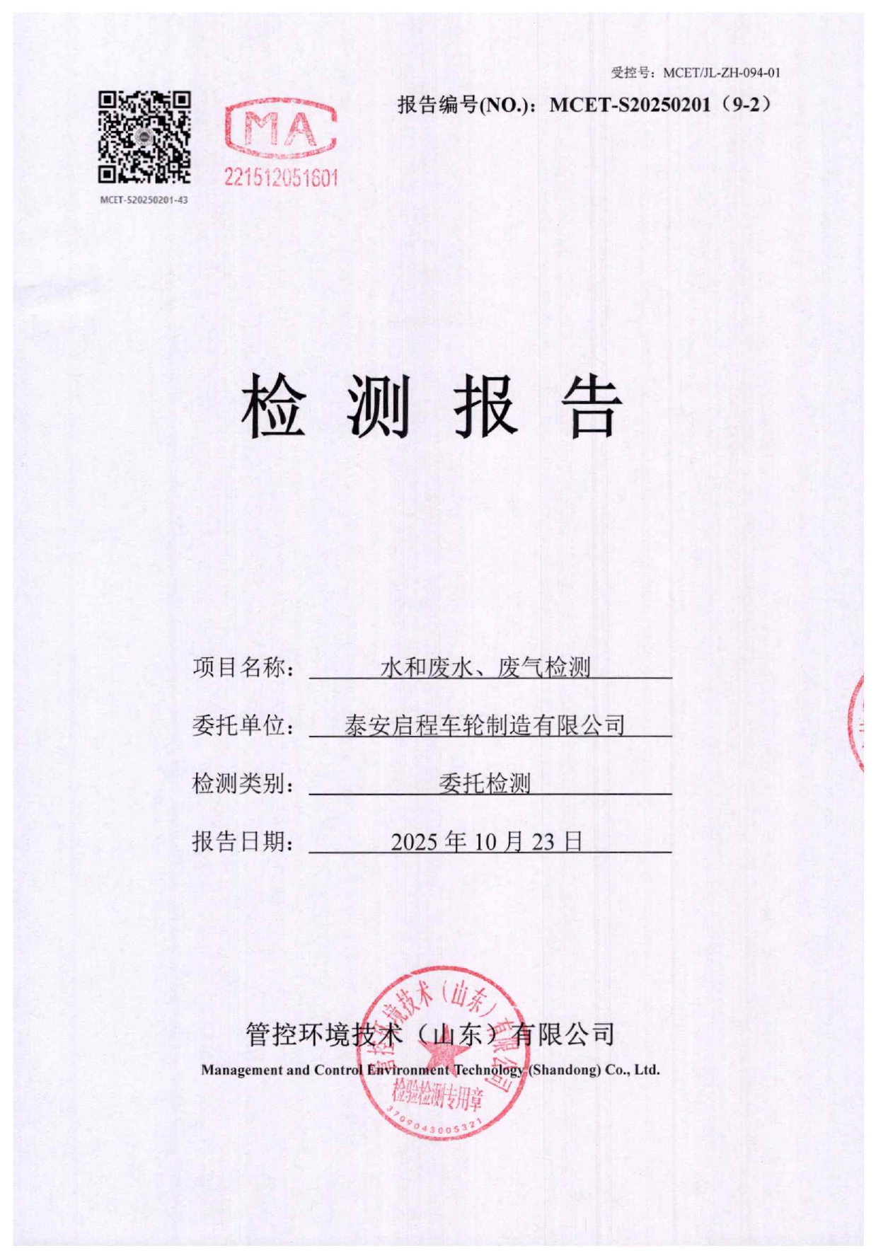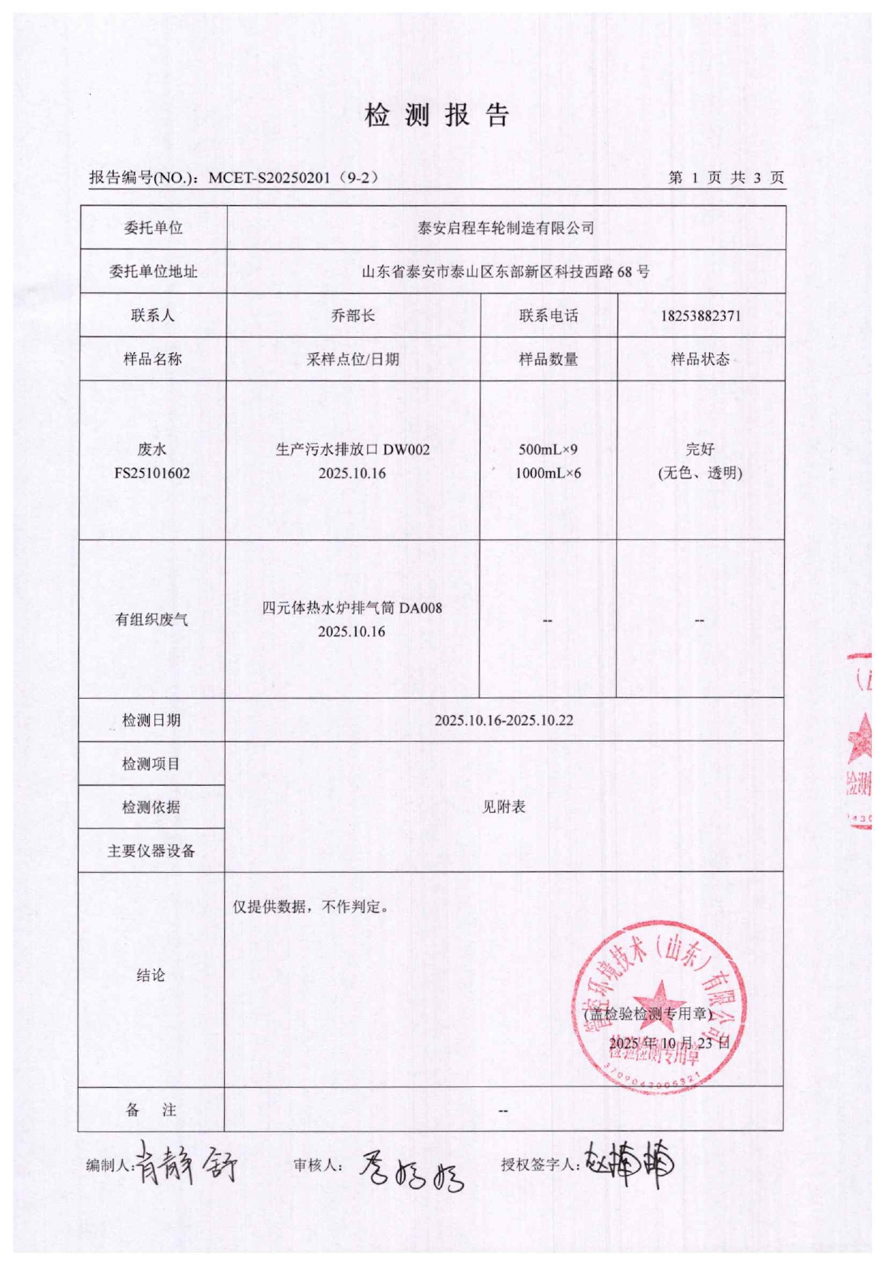 泰安啟程車輪制造有限公司2025年10月份環(huán)境污染物排放檢測(cè)報(bào)告