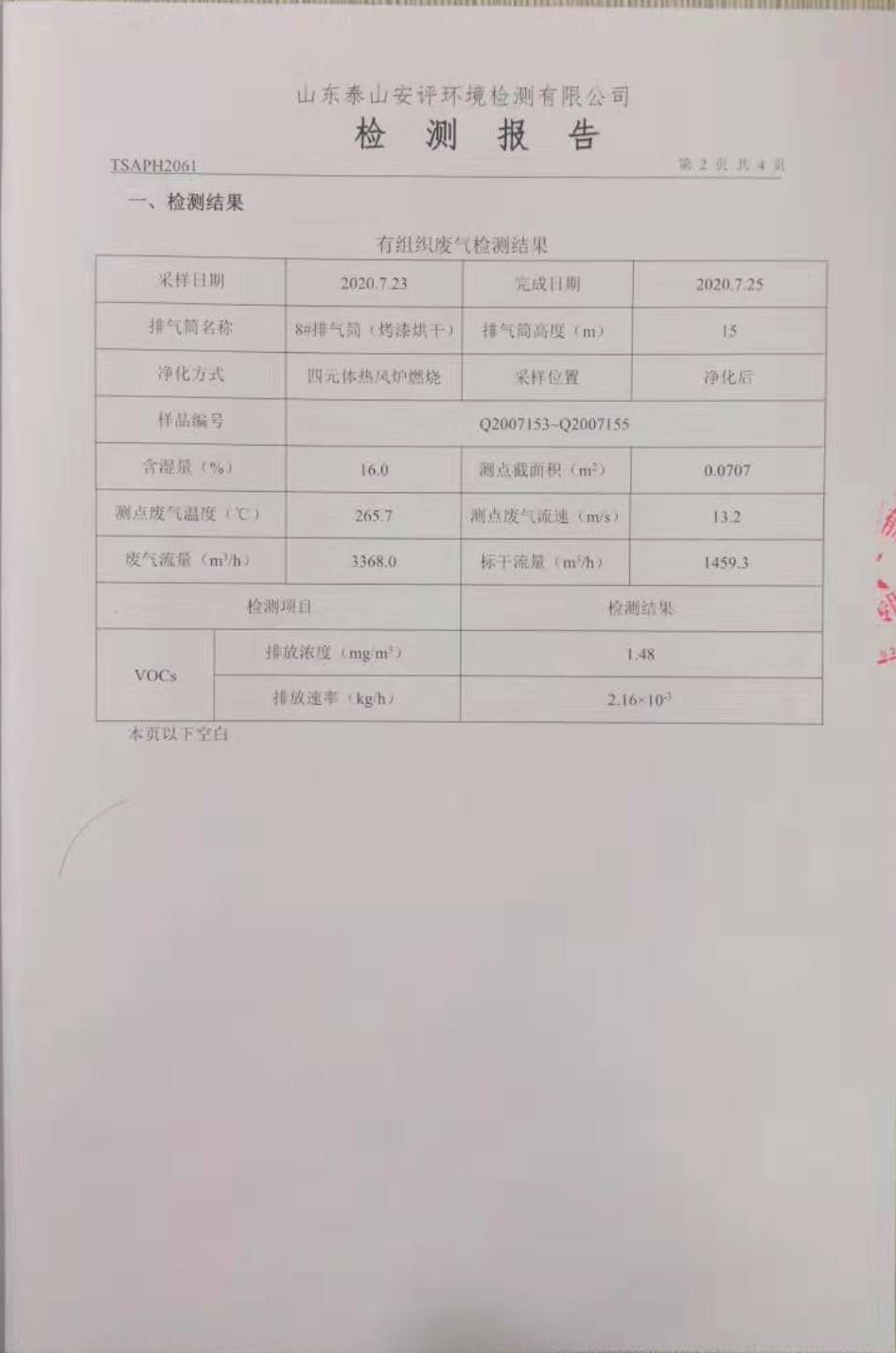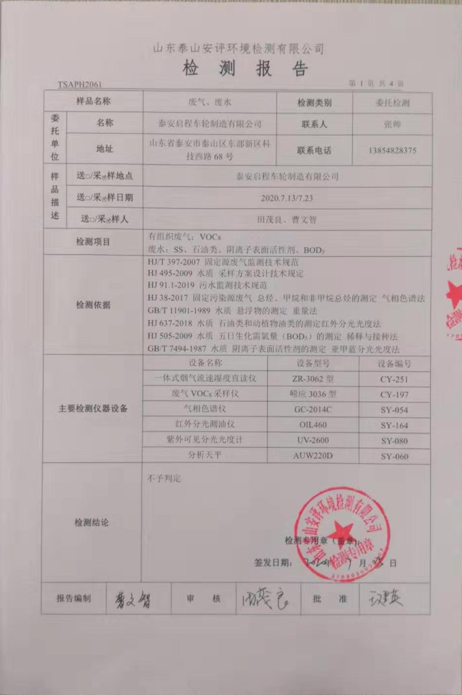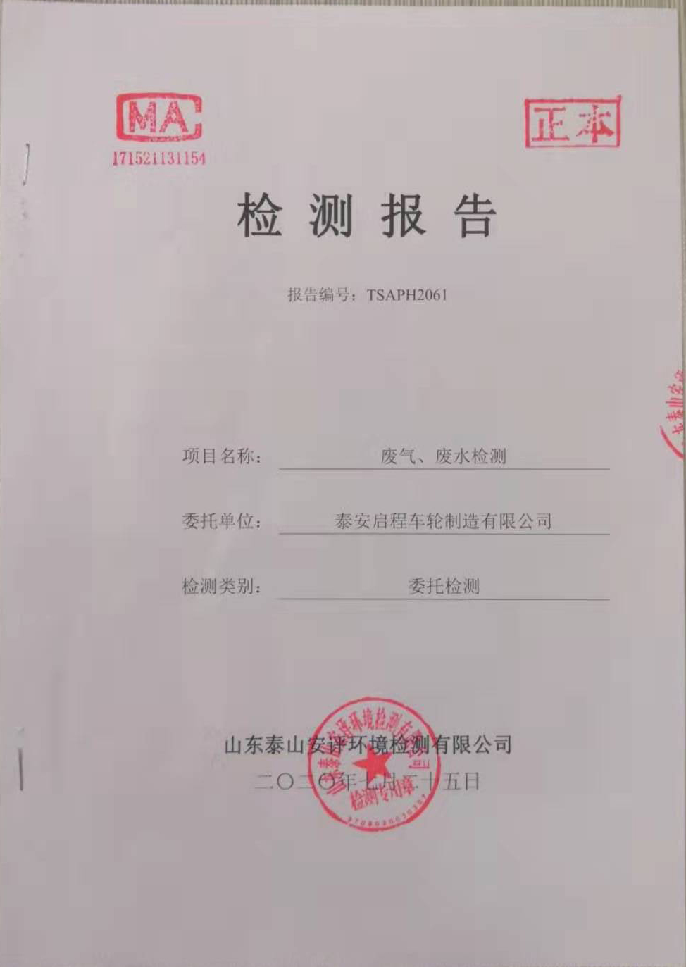 泰安啟程車(chē)輪制造有限公司2020年7月份環(huán)境污染物排放檢測(cè)報(bào)告