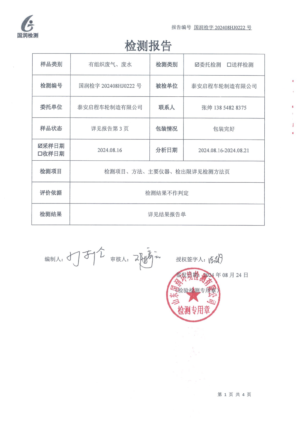 泰安啟程車輪制造有限公司2024年8月份環(huán)境污染物排放檢測報告