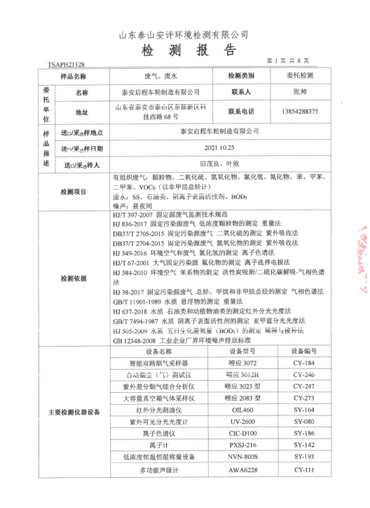 泰安啟程車輪制造有限公司2021年10月份環(huán)境污染物排放檢測報(bào)告