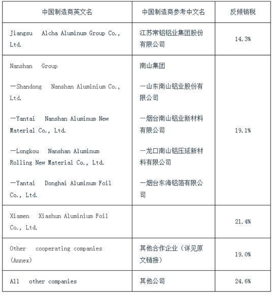 2021年10月11日,歐盟委員會(huì)發(fā)布公告,對(duì)原產(chǎn)于中國(guó)的平軋鋁材產(chǎn)品(Aluminium Flat-rolled Products)作出反傾銷肯定性終裁,對(duì)中國(guó)企業(yè)征收的反傾銷稅率為14.3%~24.6%,稅率詳見下表。